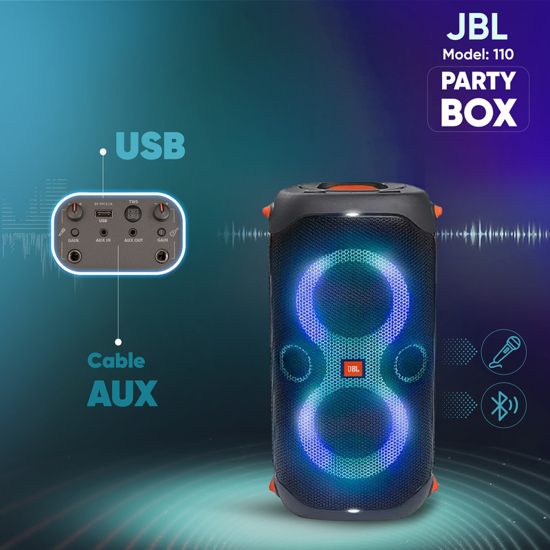 اسپیکر jbl قدرتمند و قابل حمل JBL PartyBox 110 میتوانید مهمانی را با صدای قدرتمند و نمایش نور پویا شروع کنید. این دستگاه با نورپردازی منحصر به فرد LED هماهنگ شده، با صدای قدرتمند و باس عمیق، برای هر مهمانی، محتوای جدیدی به ارمغان میآورد.